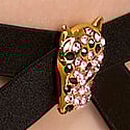 With couture inspiration, this caged, ouvert Panty is crafted in a series of bold straps highlighted with crystal-encrusted, leopard-head hardware. The result is daring and dramatic—take it up a notch with the matching open-cup Bra.